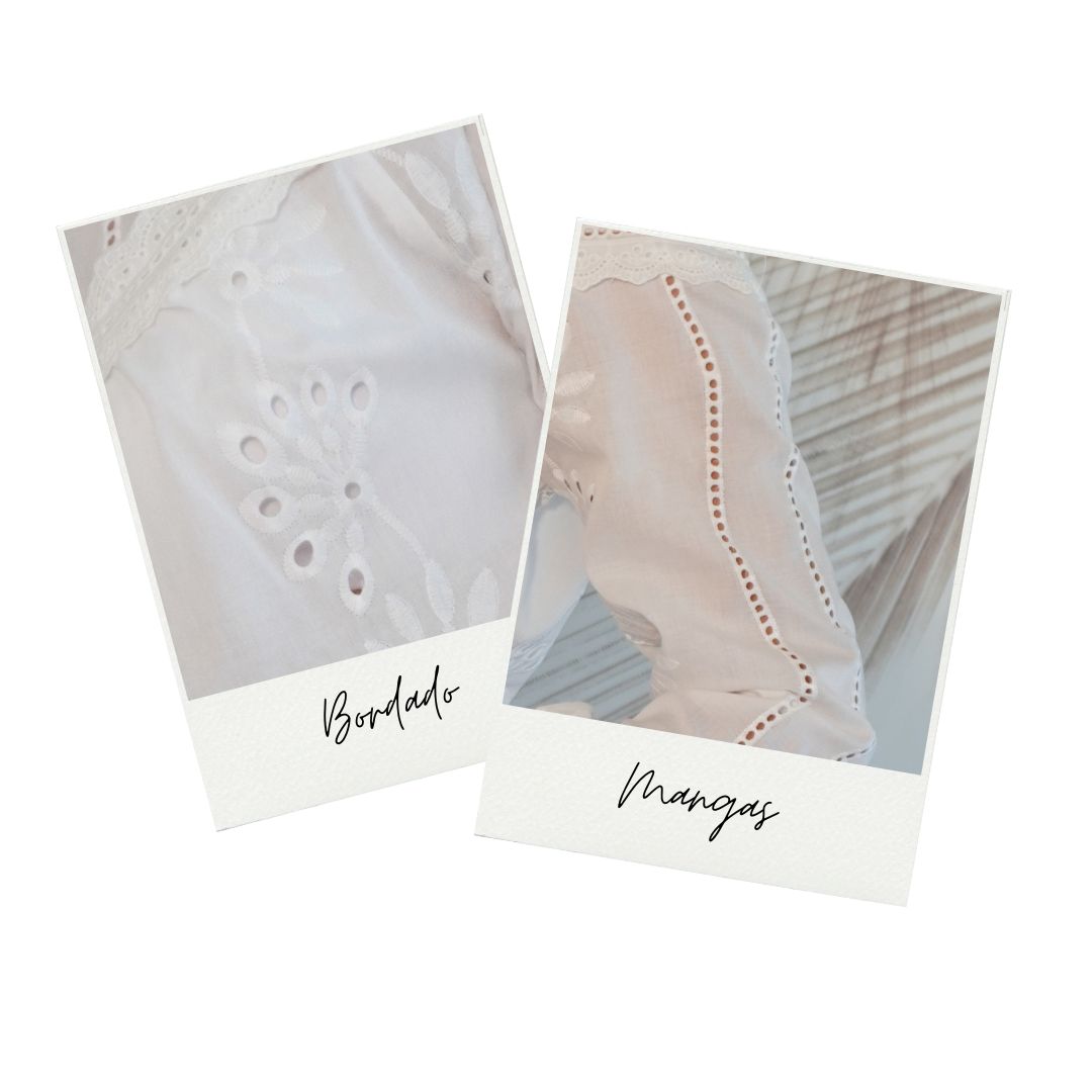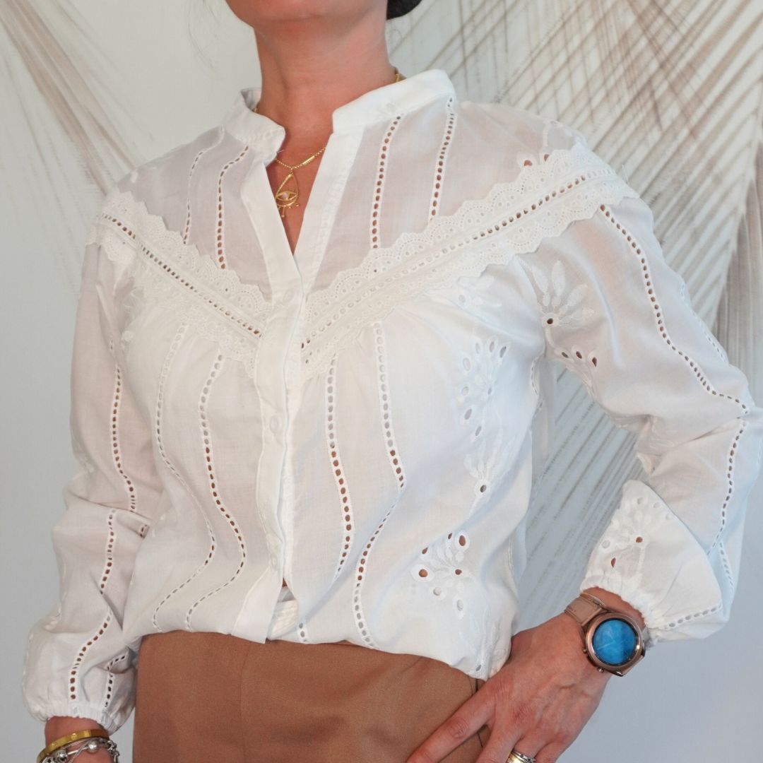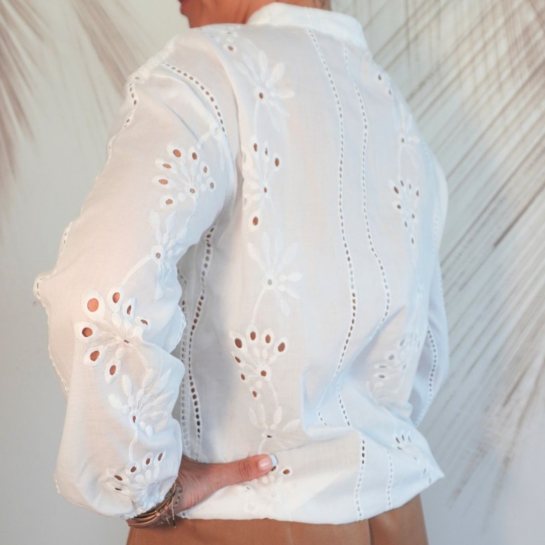 Blusa blanca manga larga, con detalles bordados y broderie. Cuello Mao.