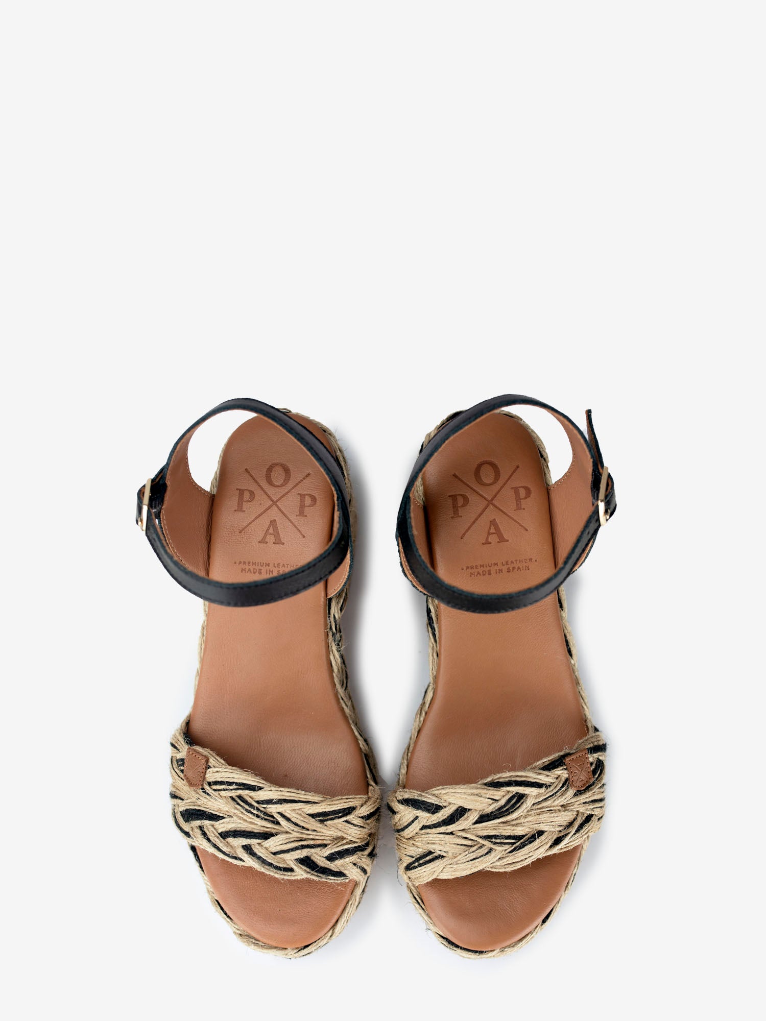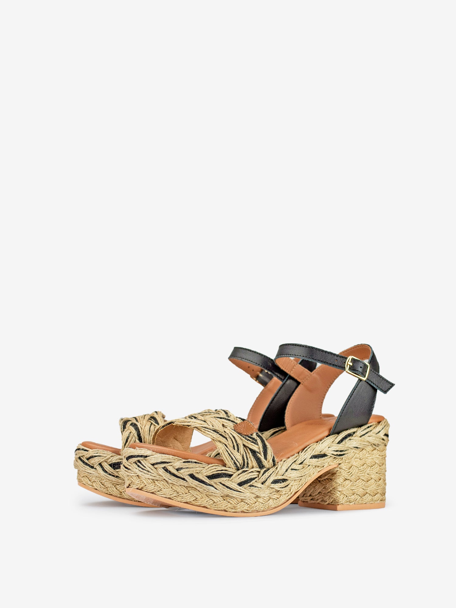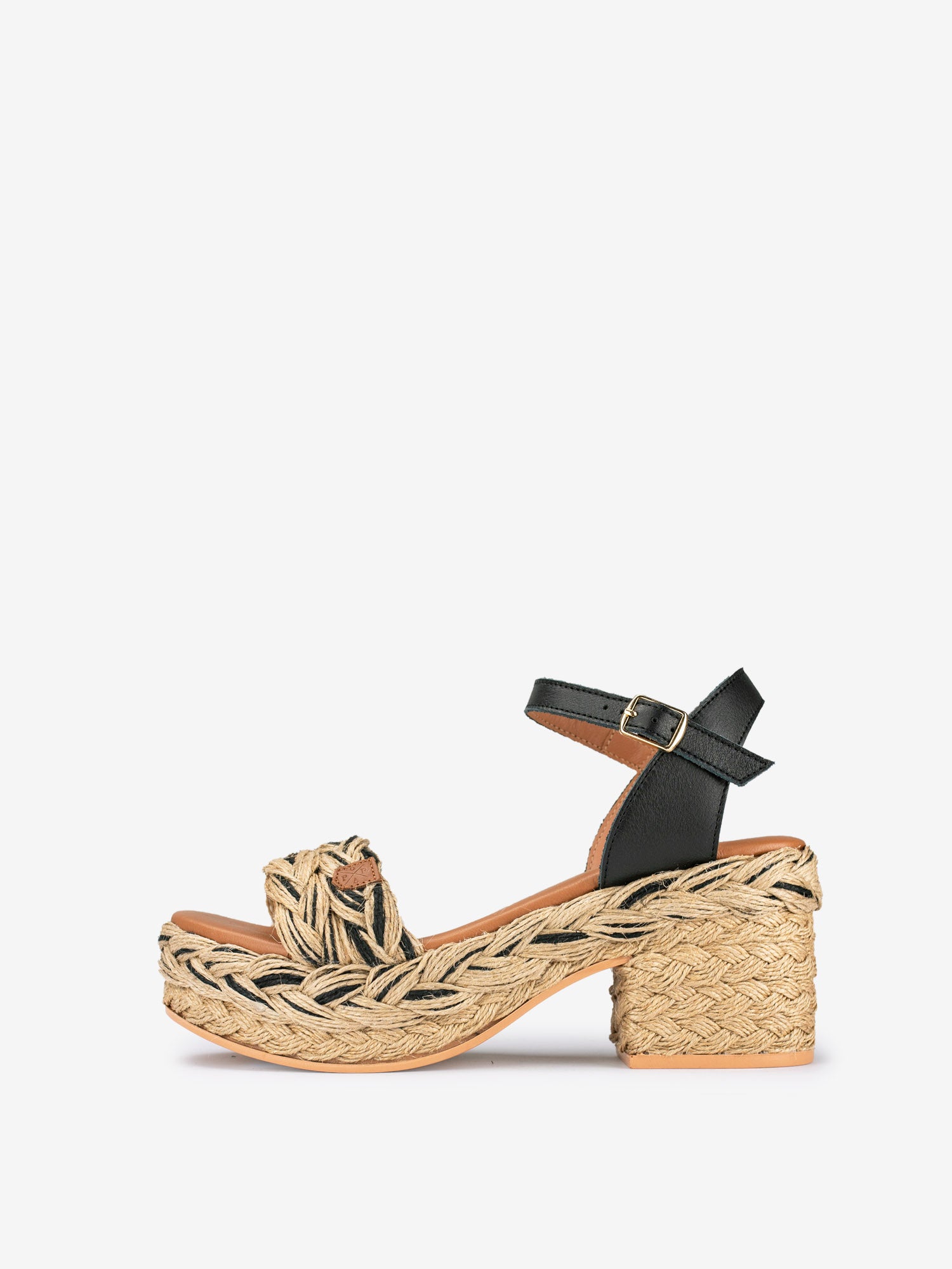 - Sandalia, pala trenzada en yute y negro, con tira trasera atada al tobillo mediante una pulsera con cierre en hebilla en color negro.