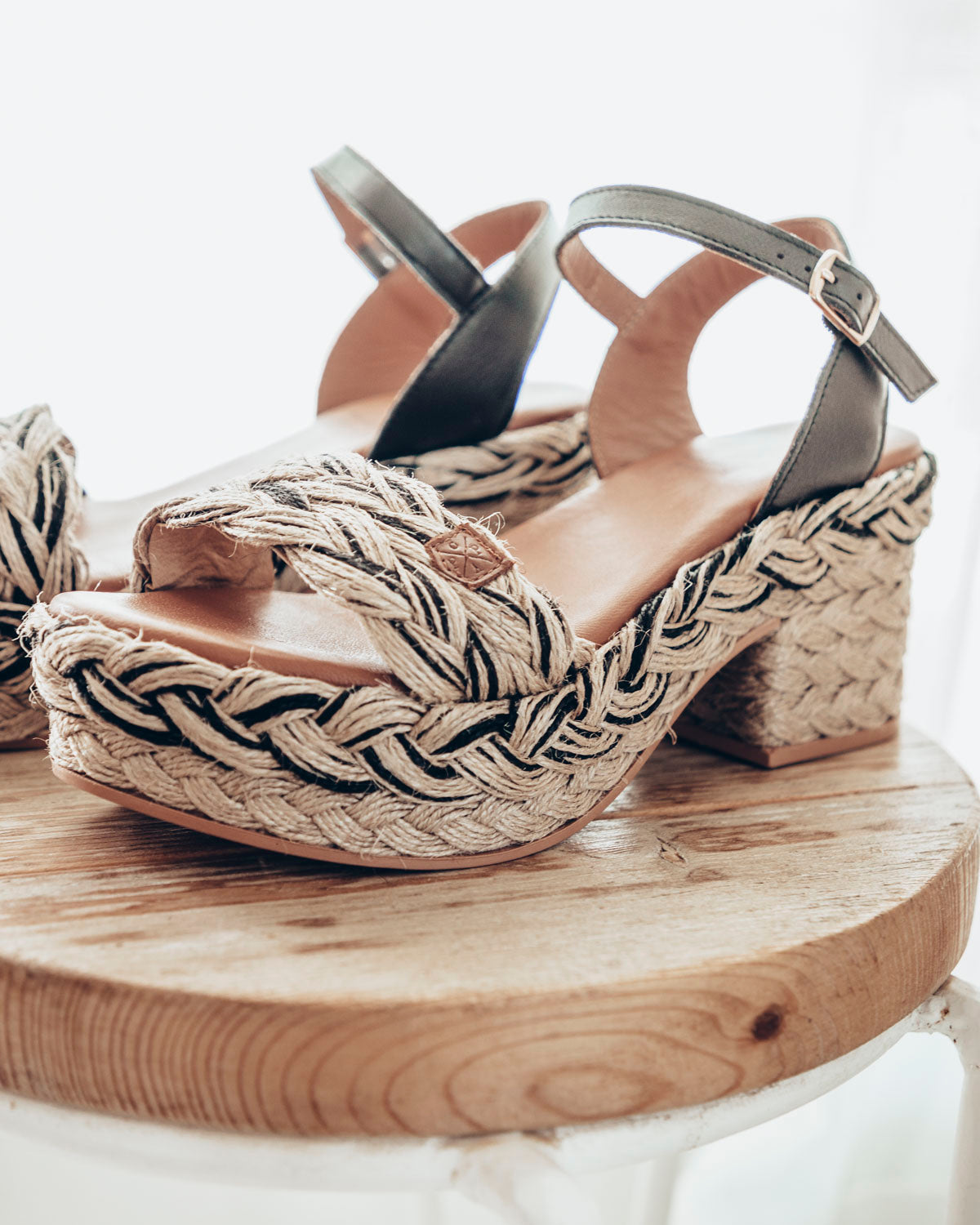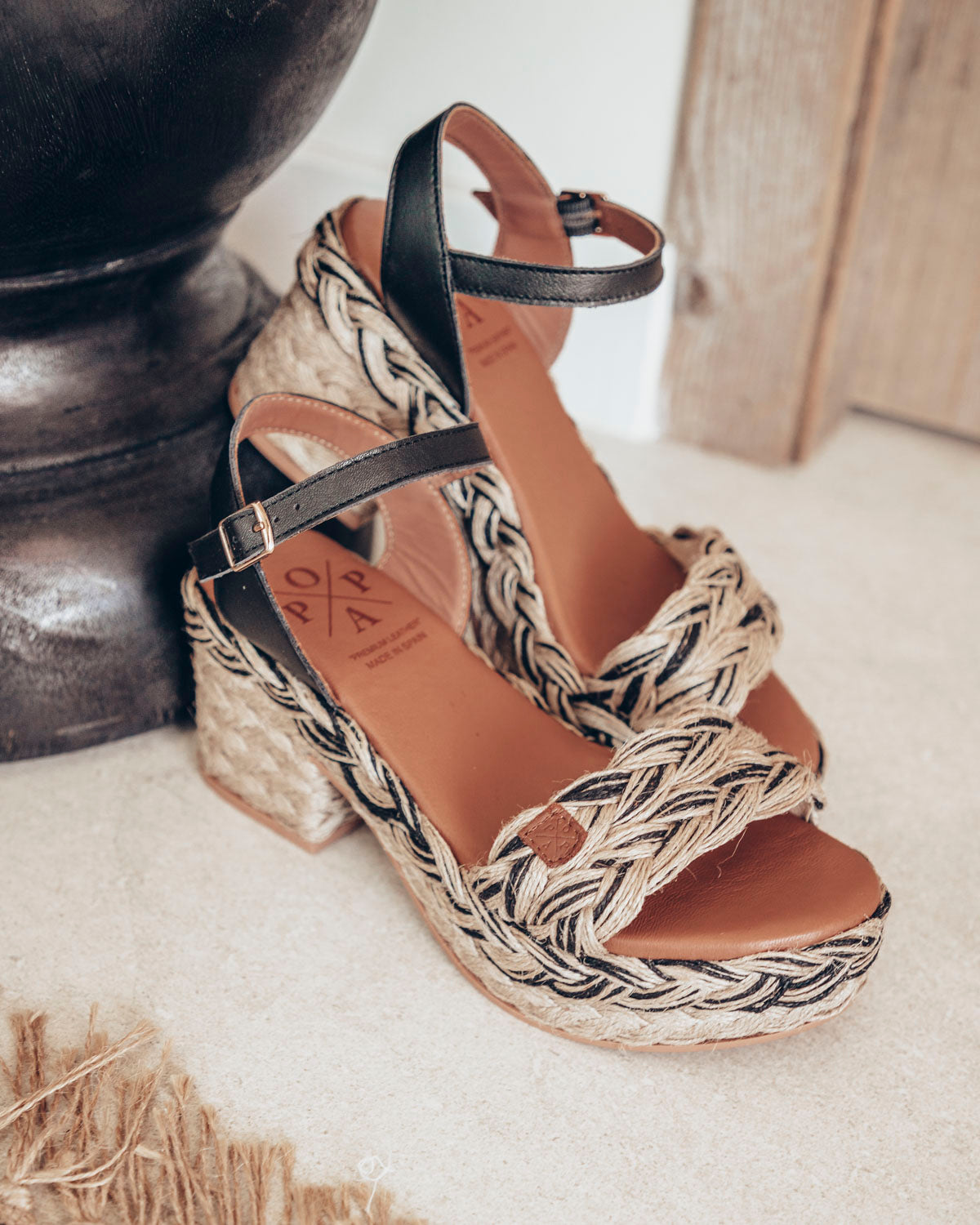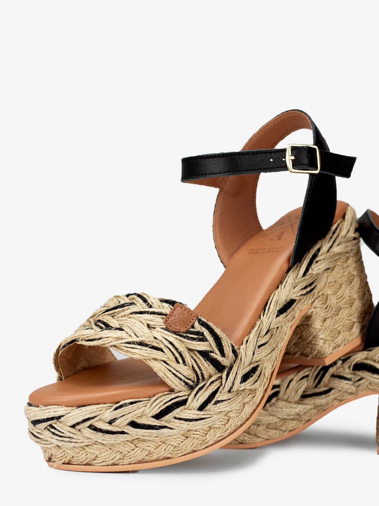 - Sandalia, pala trenzada en yute y negro, con tira trasera atada al tobillo mediante una pulsera con cierre en hebilla en color negro.