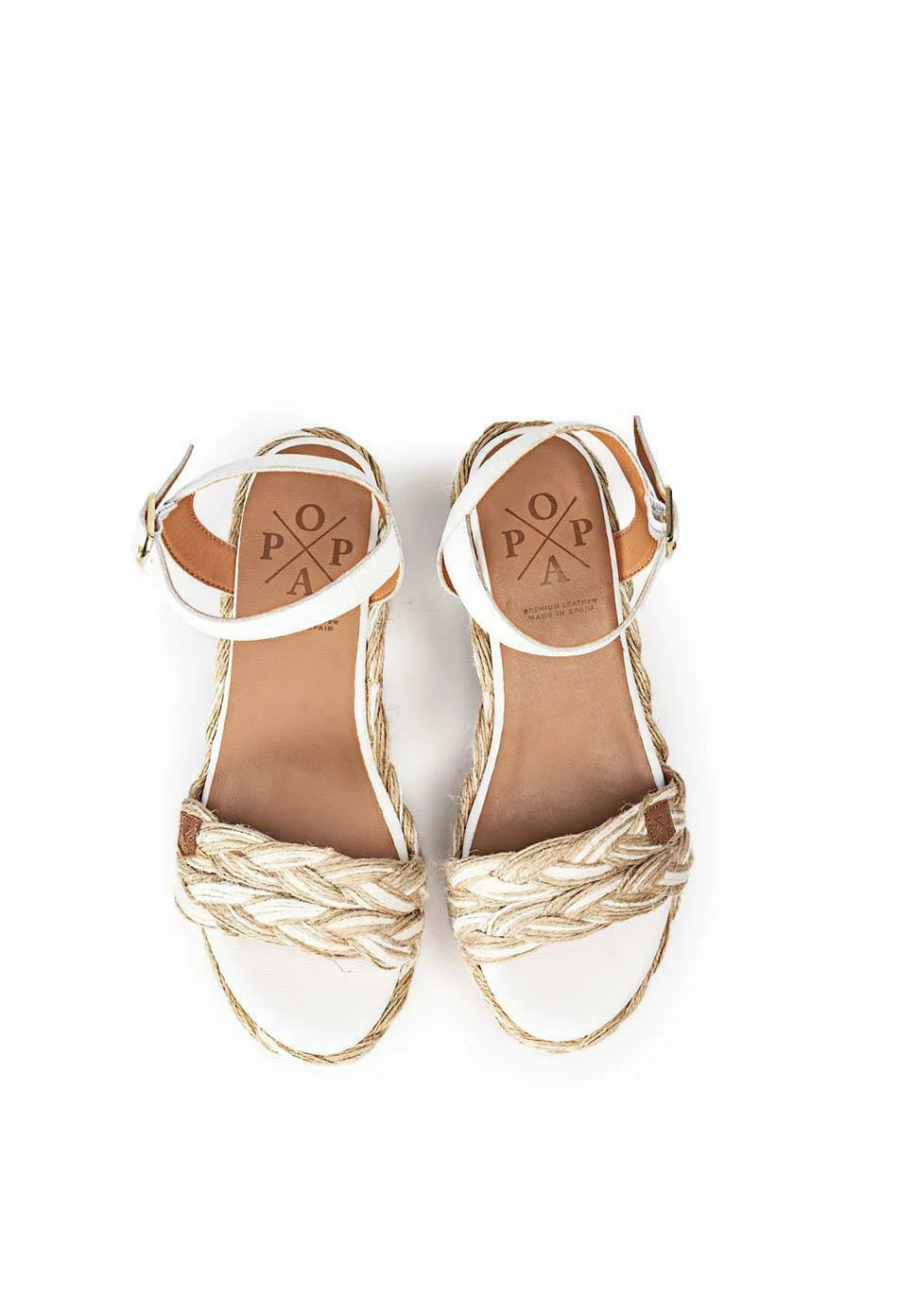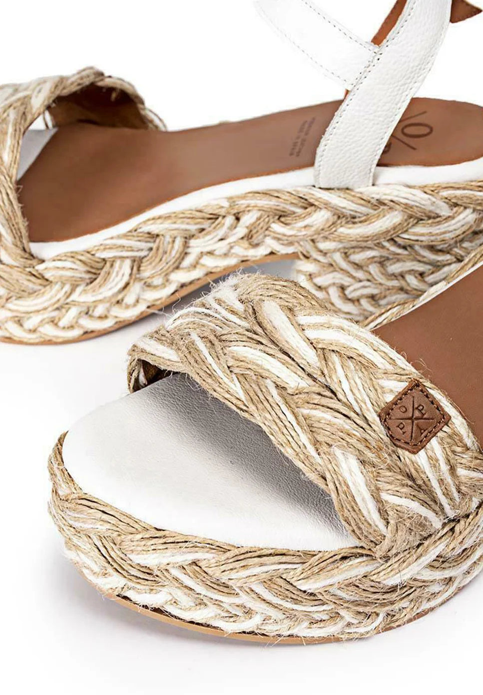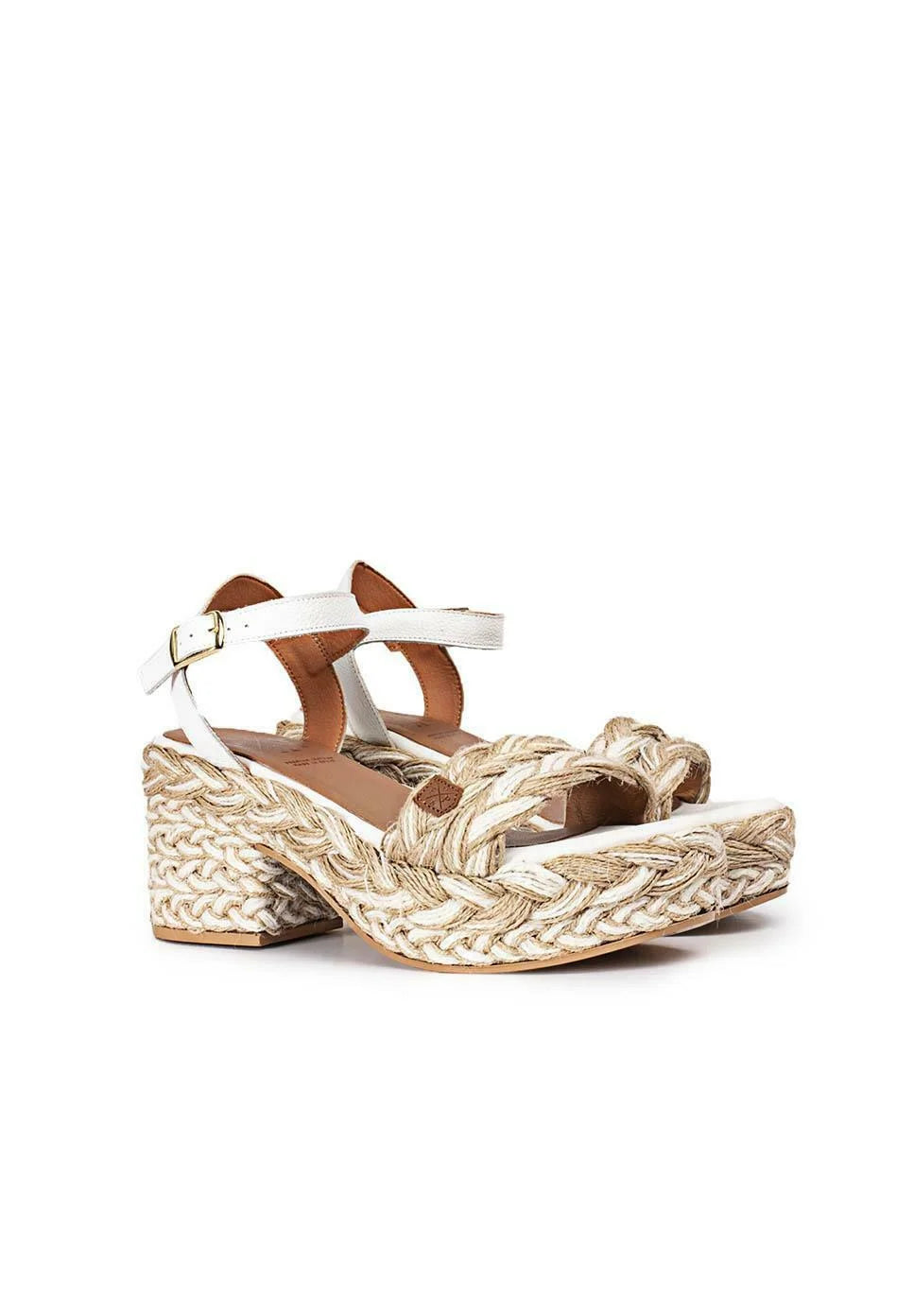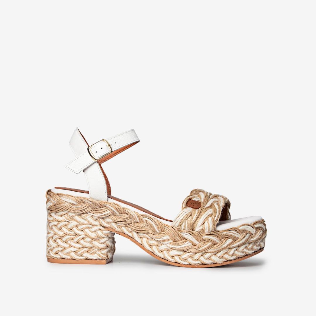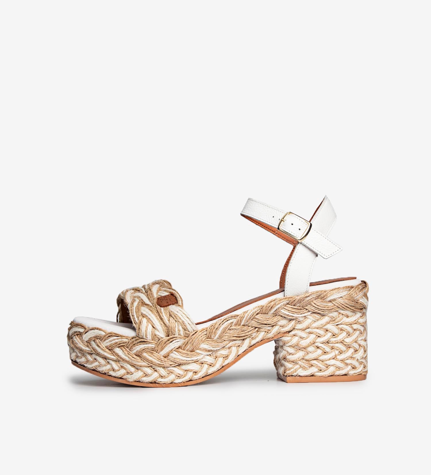 - Sandalia fabricada en yute y cuero blanco. Detalles trenzados en blanco.