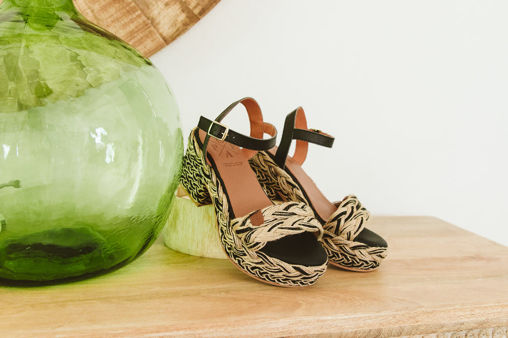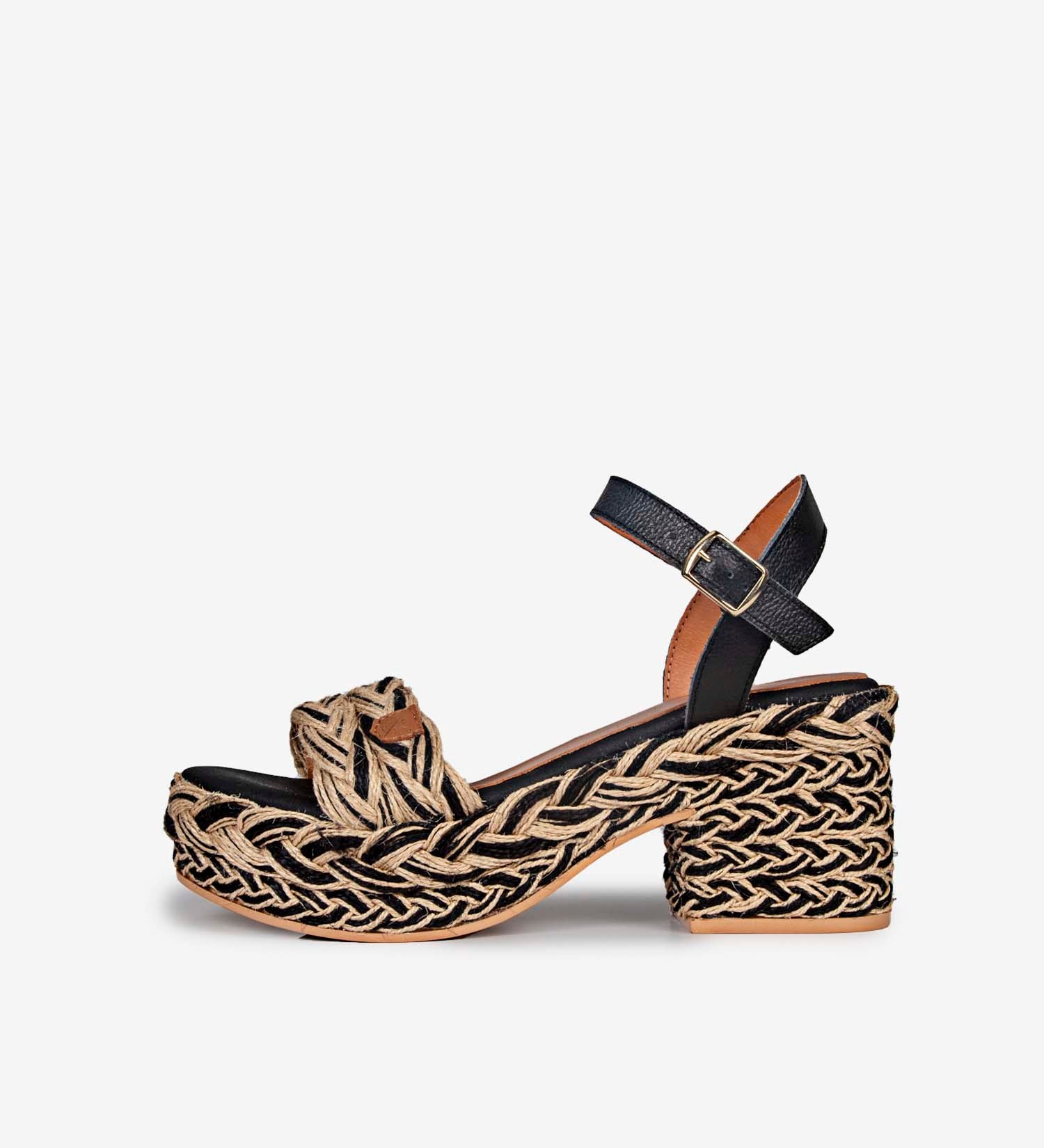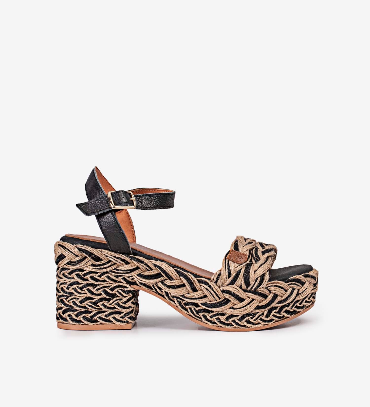 - Sandalia fabricada en yute y cuero negro. Detalles trenzados en negro.
