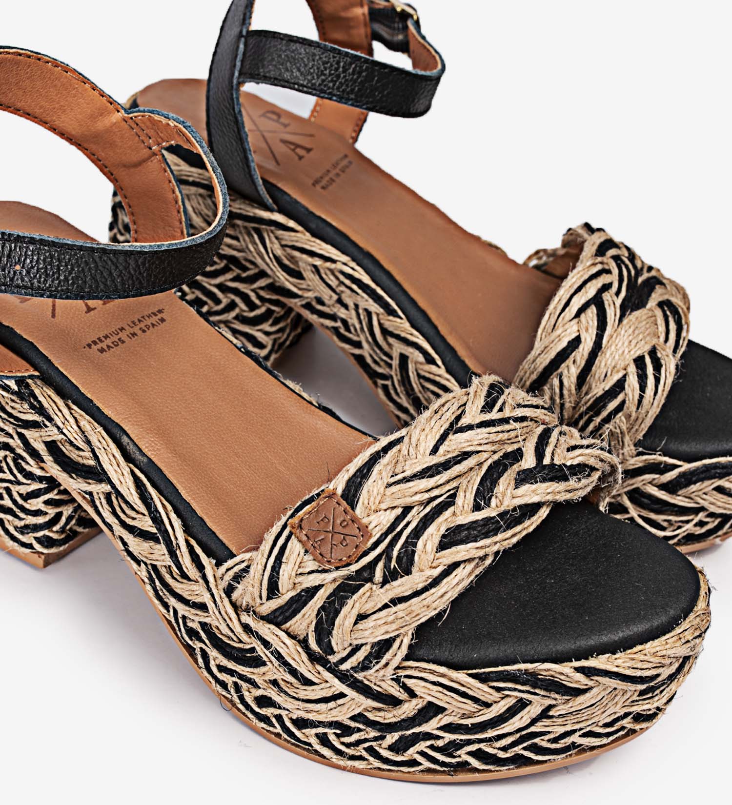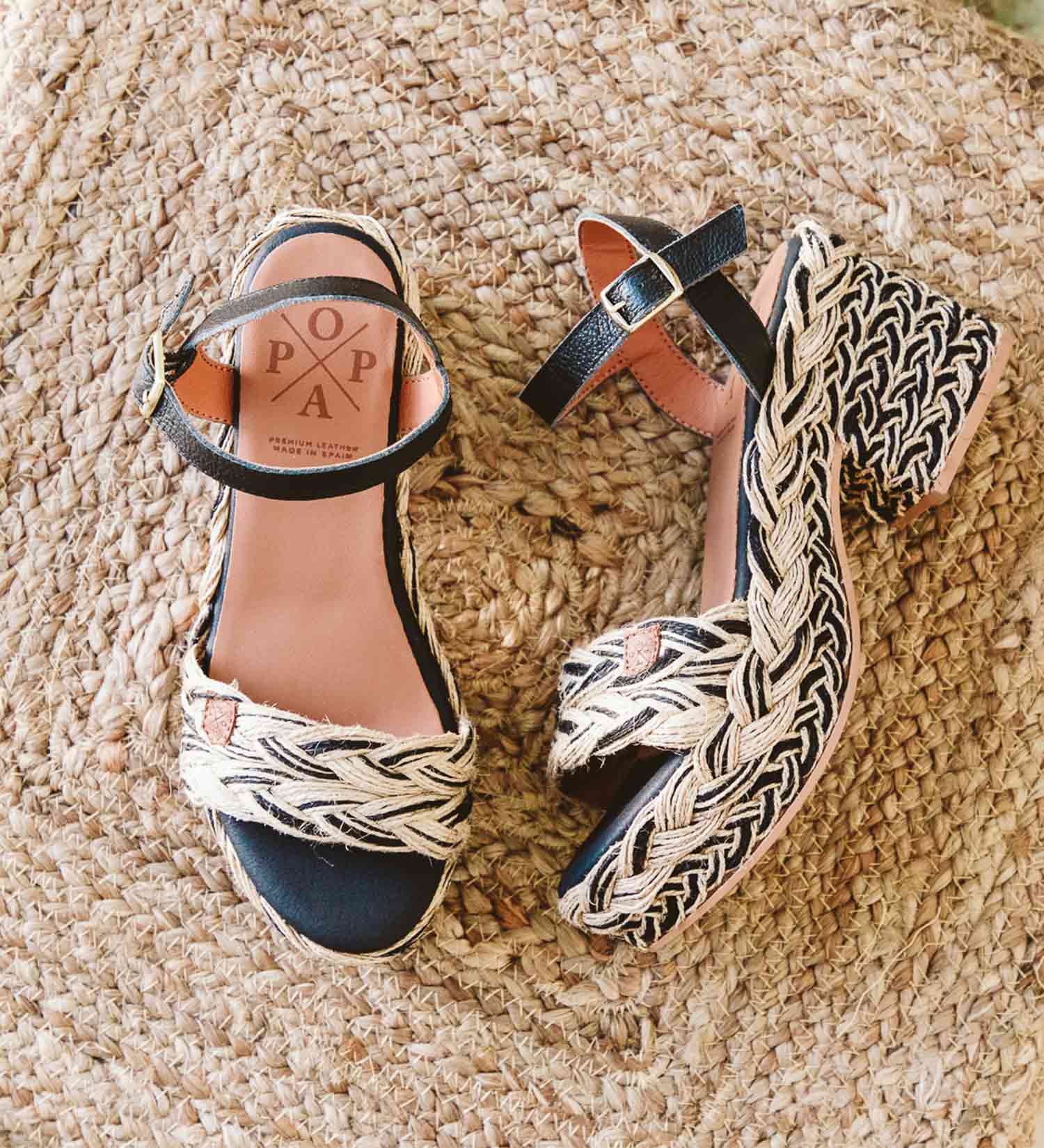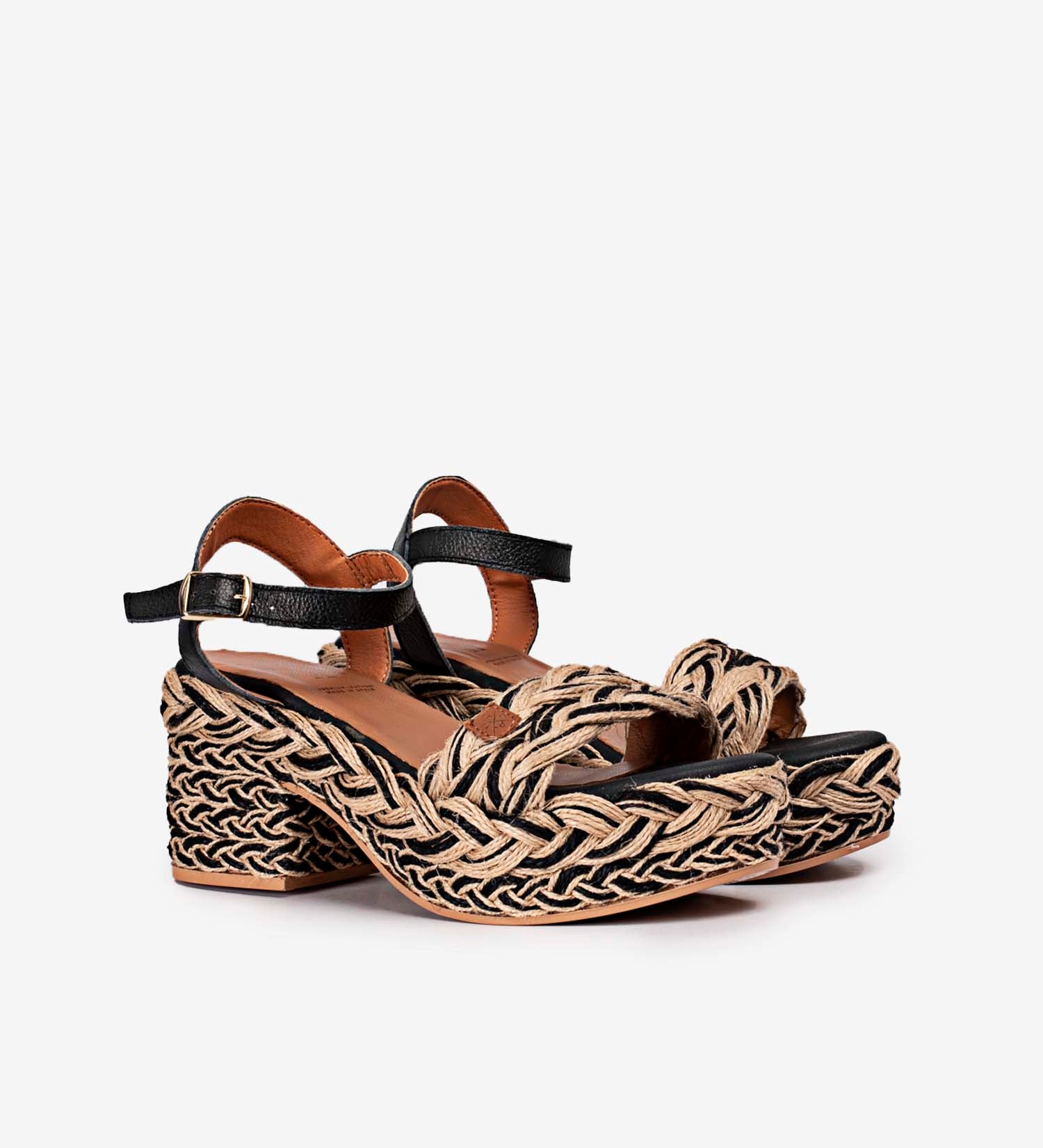 - Sandalia fabricada en yute y cuero negro. Detalles trenzados en negro.