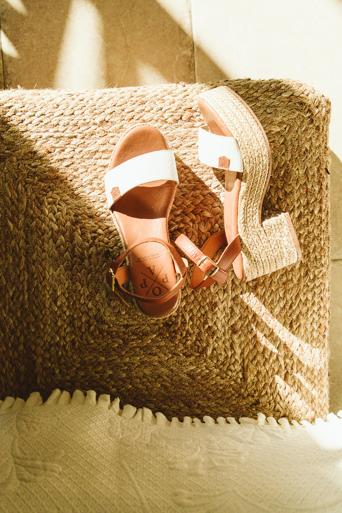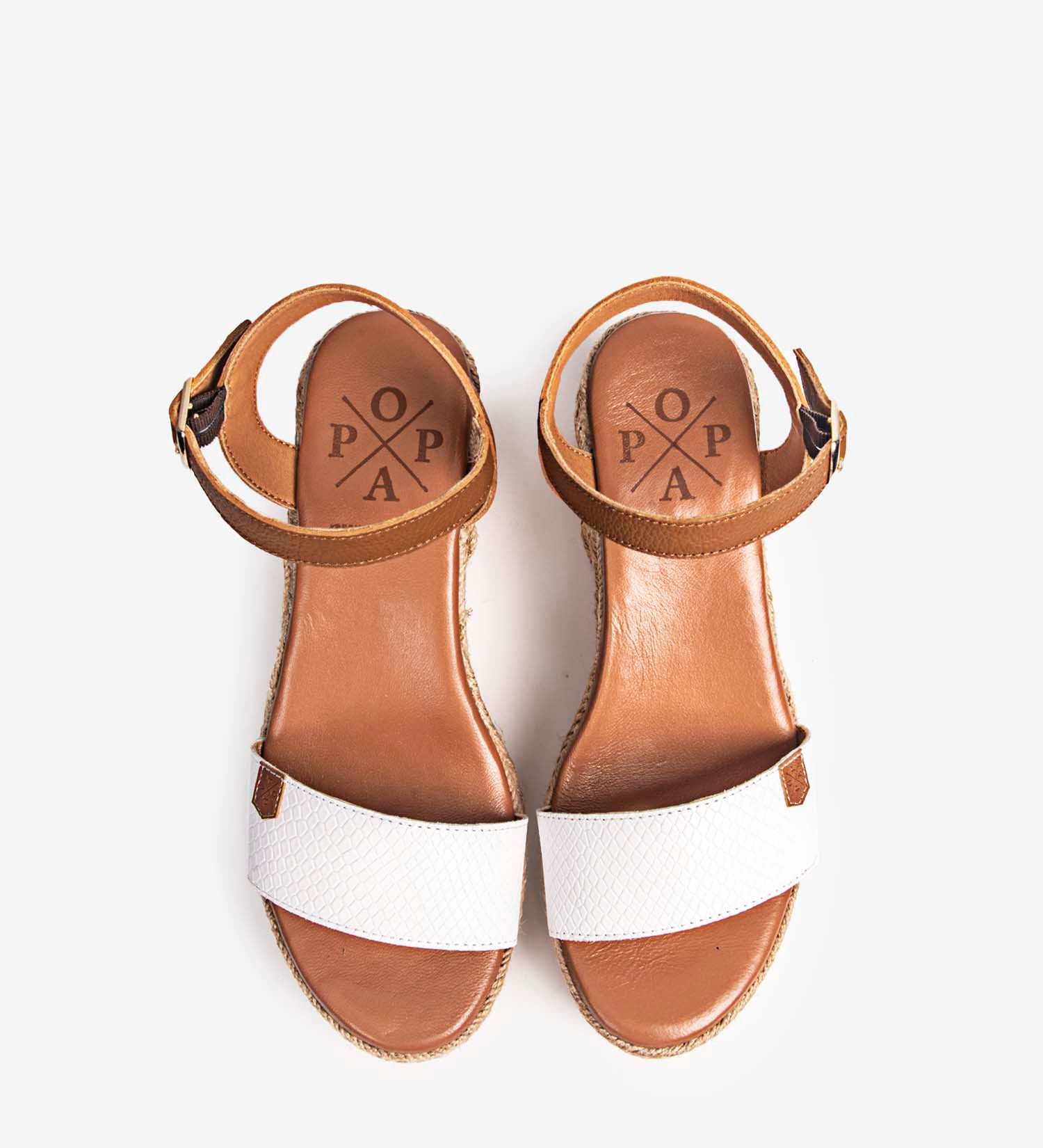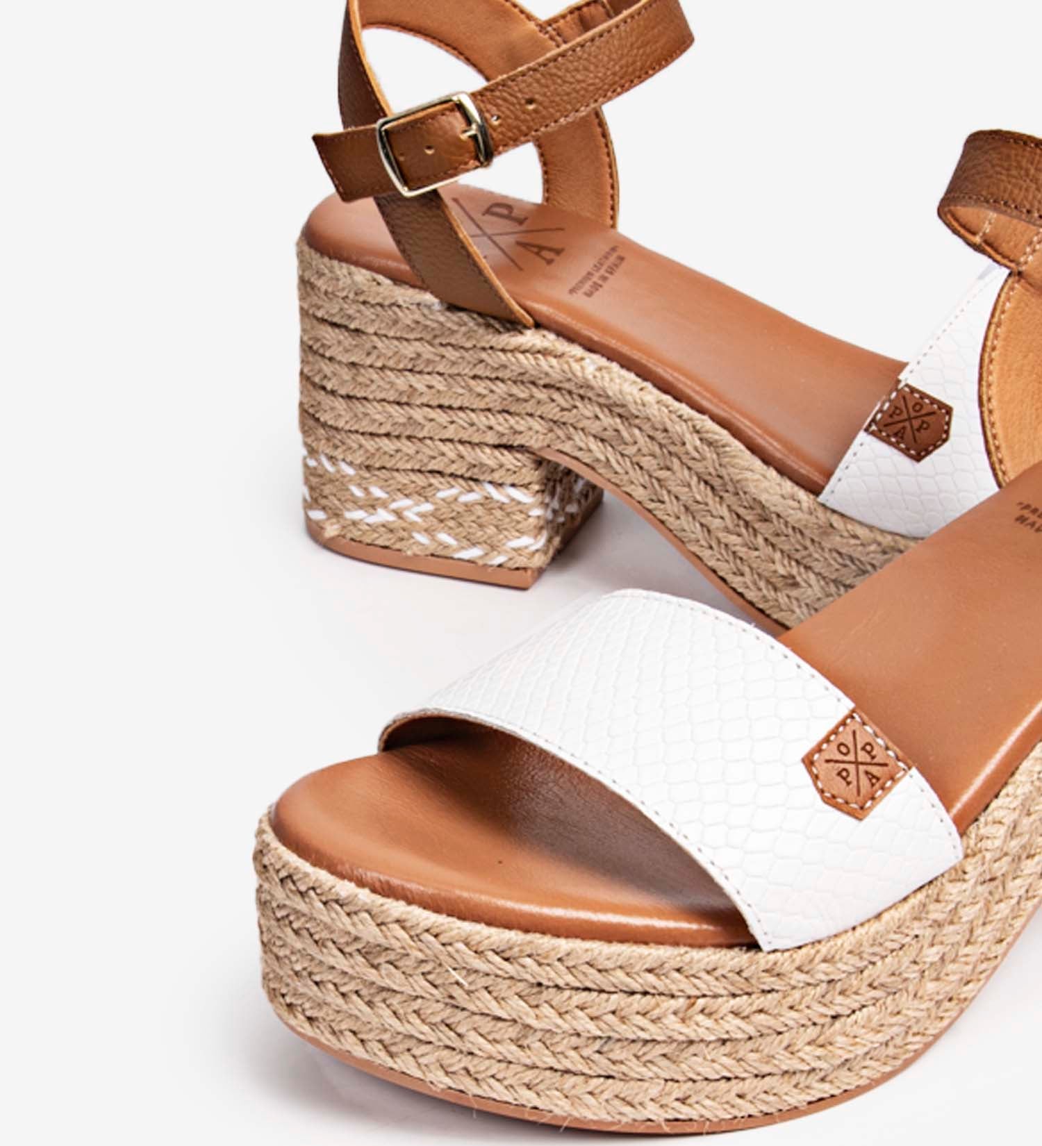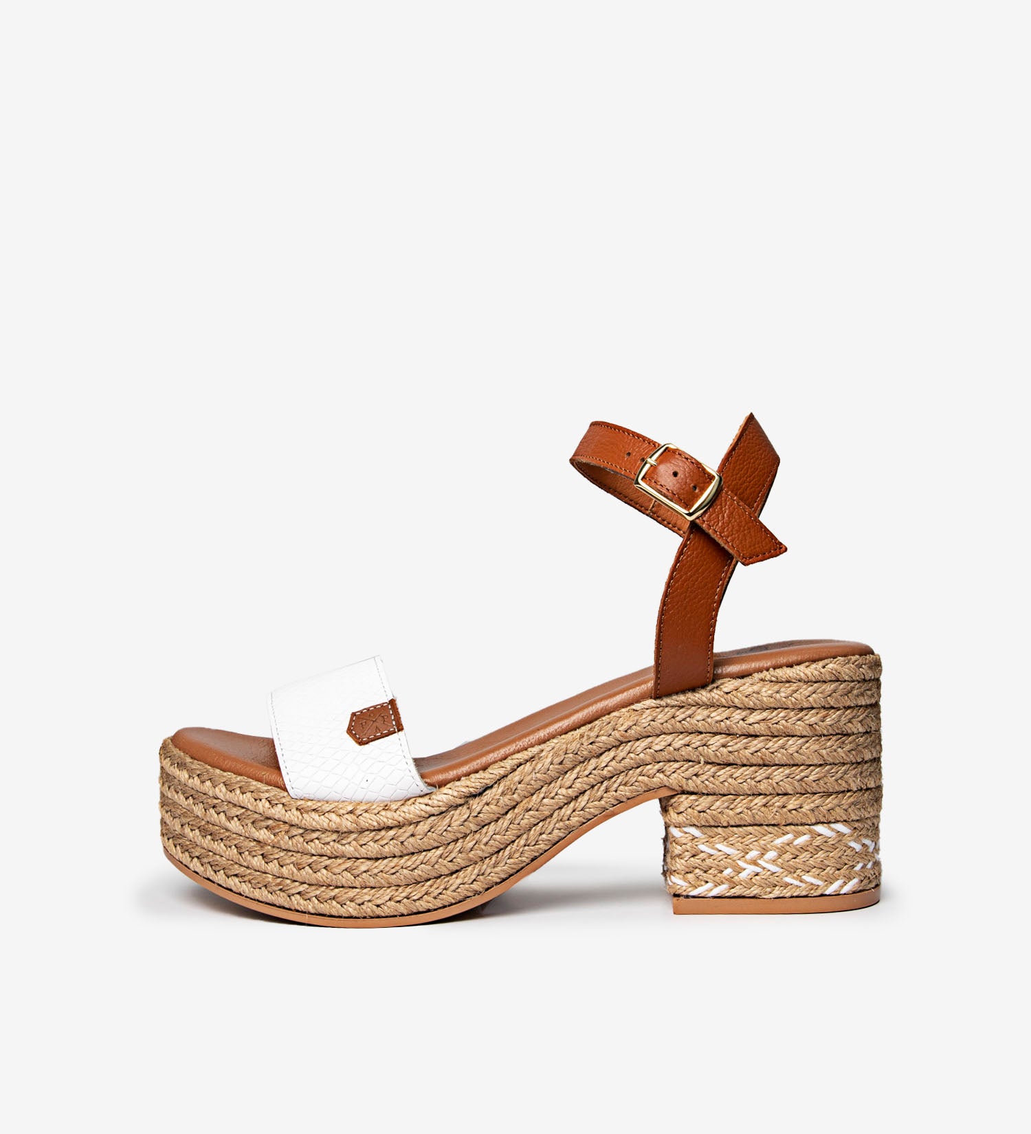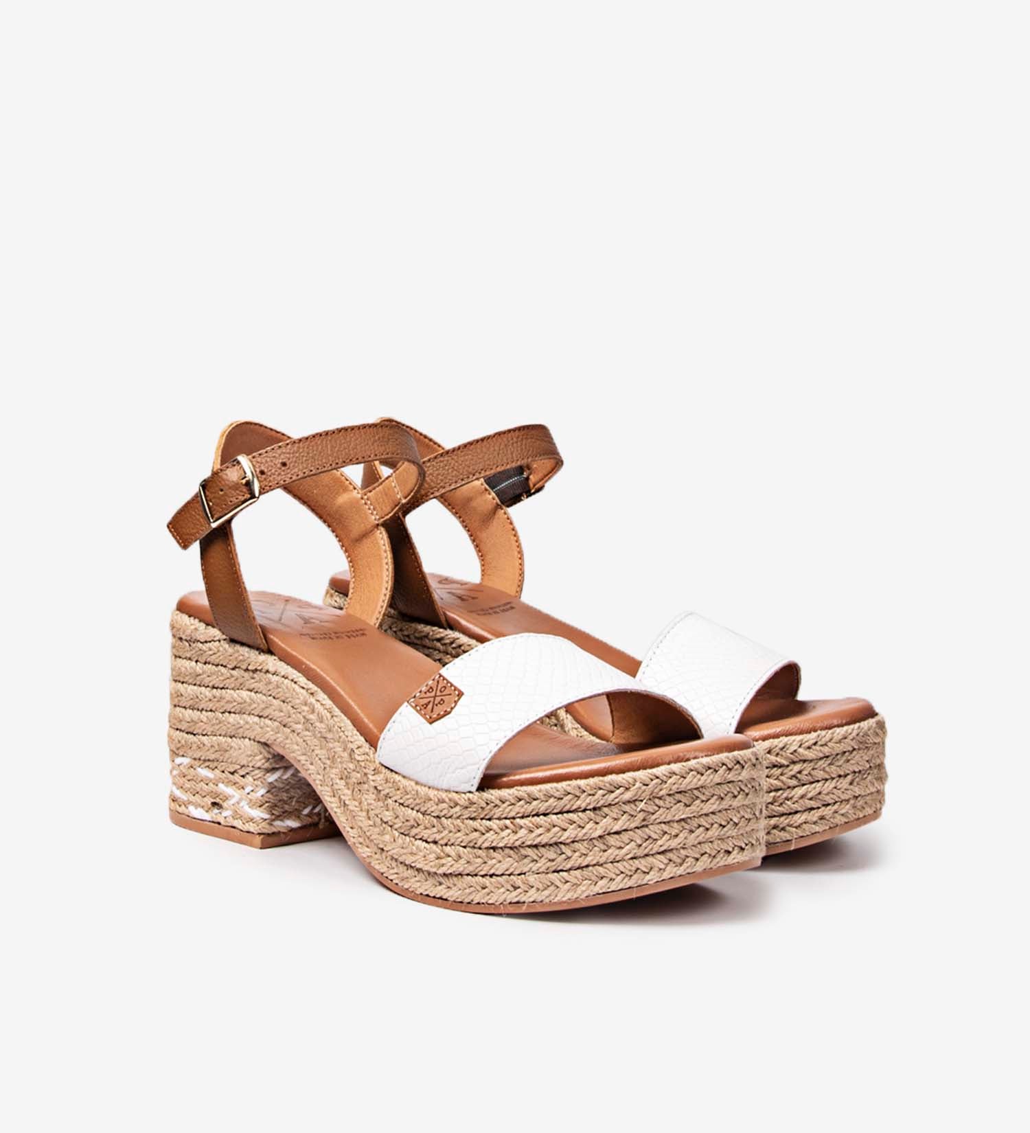 - Sandalia fabricada en yute y cuero. Color blanco y café.